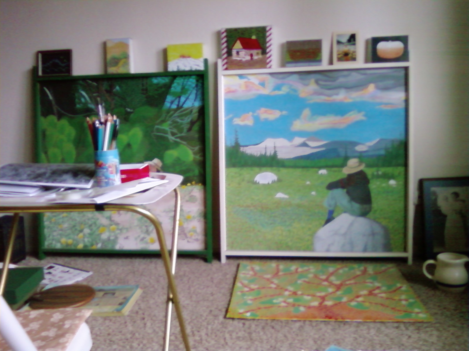 The loon has been pondering and working on those clouds in the painting on the right for weeks. The blurry phone photo gives a washed out vague idea of the satisfactory result. (The painting is of a meadow in the high country of Yosemite.)