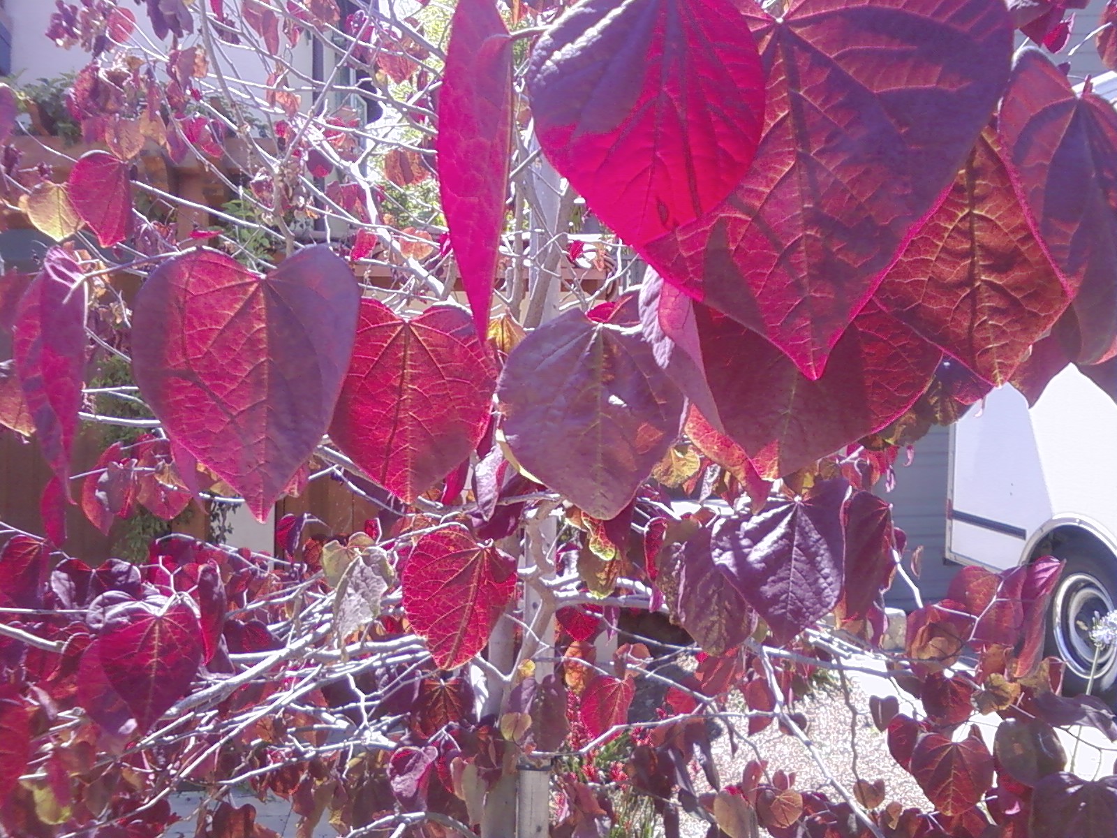 The options for titling this photo are numerous: ‘Limousine Ride with Francis Scott Key’ or ‘Self Portrait in the Laundry Room’ or ‘Daisy Hangs ‘Em High’ or ‘The Bird Emporium’ or ‘Rafting with Elvis’. In this particular case, however, the best title happens to be ‘Red Leaves and Just a Little Bit of the Rear Part of Some Sort of Van with One Wheel Showing, Not to Mention the Obscured Section of Apartment Building on the Left’.